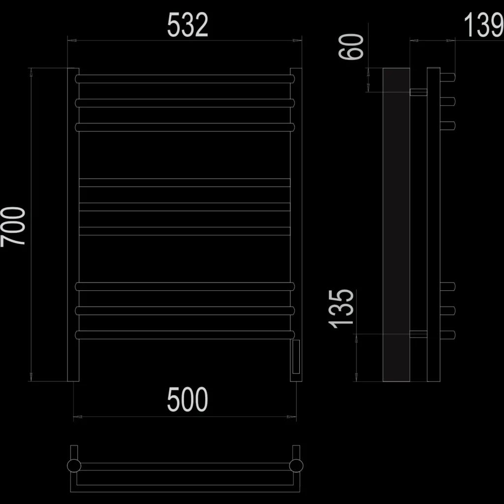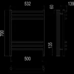 Полотенцесушитель электрический Terminus IDEAL ЭПС Прато Электро П9 500×700, 700 мм высотой, 530 мм шириной, 9 перекладин, нижнее подключение, хромированный