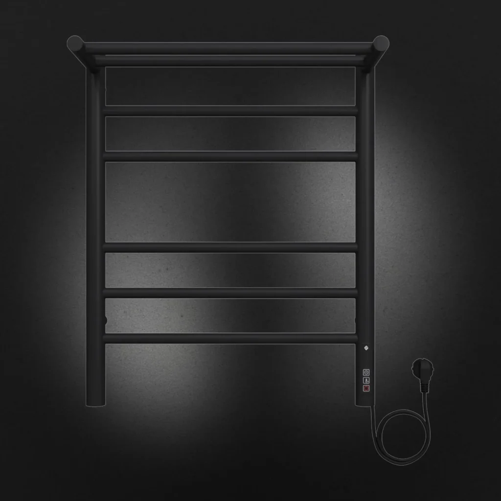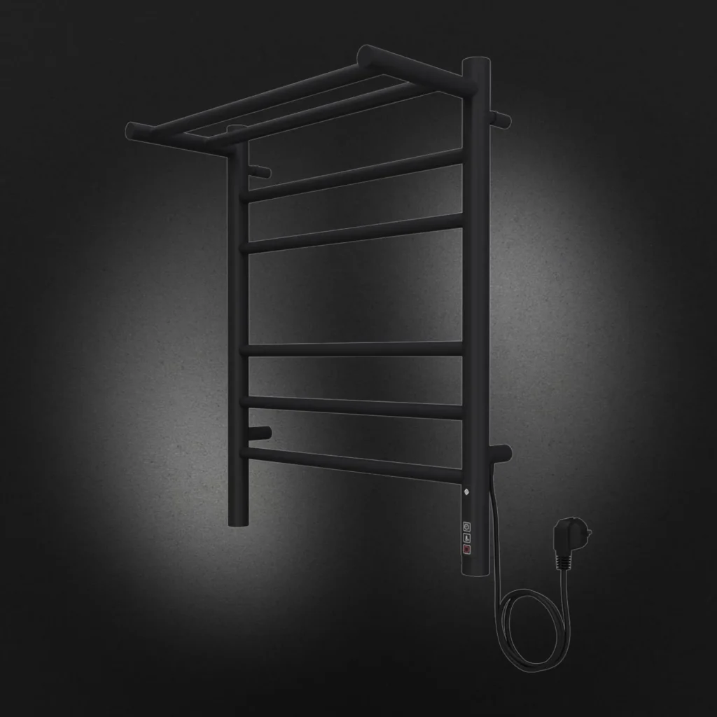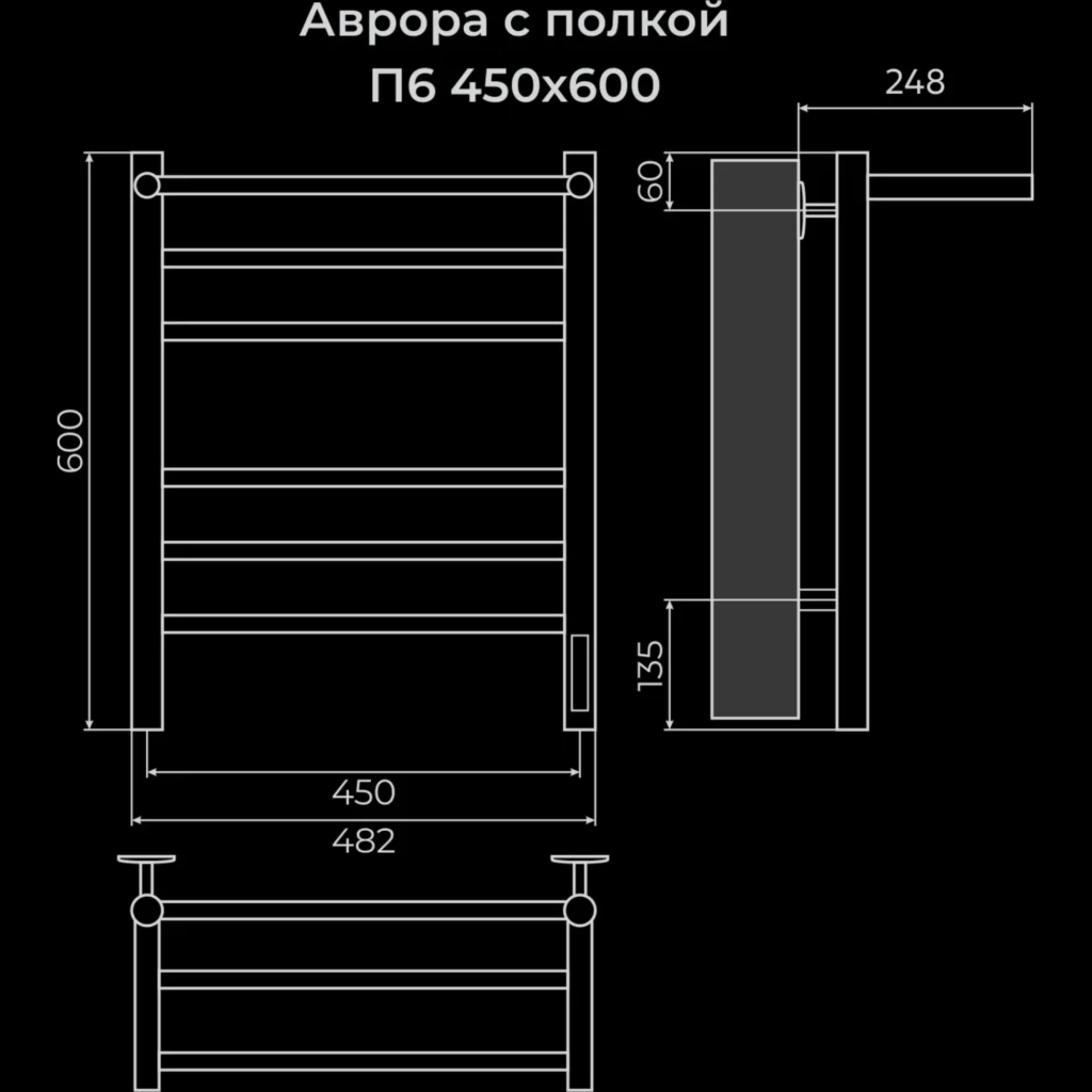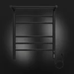 Полотенцесушитель электрический Terminus TREND ЭПС Аврора Электро с полкой КС П6 450×600 чёрный, 600 мм высотой, 482 мм шириной, 6 перекладин, нижнее подключение, чёрный