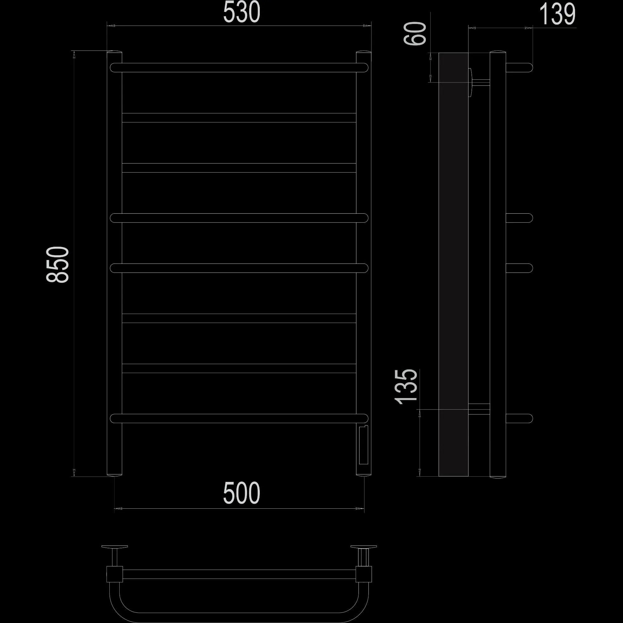 Полотенцесушитель электрический Terminus TREND ЭПС Евромикс квадро Электро П8 500×850, 850 мм высотой, 530 мм шириной, 8 перекладин, нижнее подключение, хромированный
