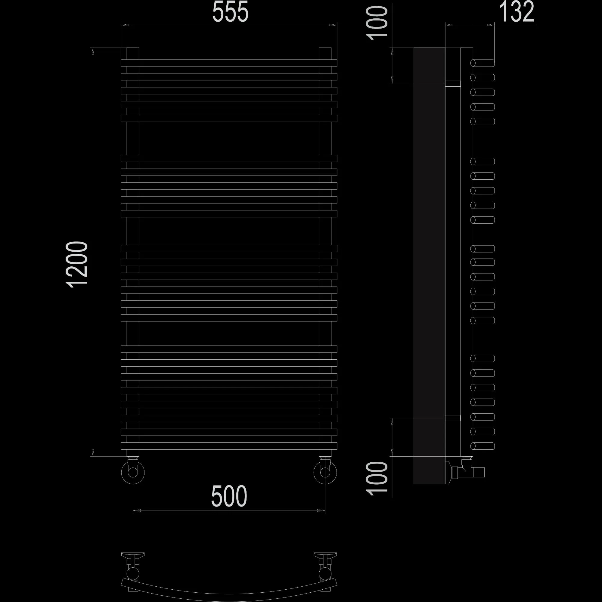 Полотенцесушитель водяной Terminus IDEAL+ Марио П24 500×1200, 1200 мм высотой, 555 мм шириной, 24 перекладины, нижнее подключение 1/2 дюйма, хромированный