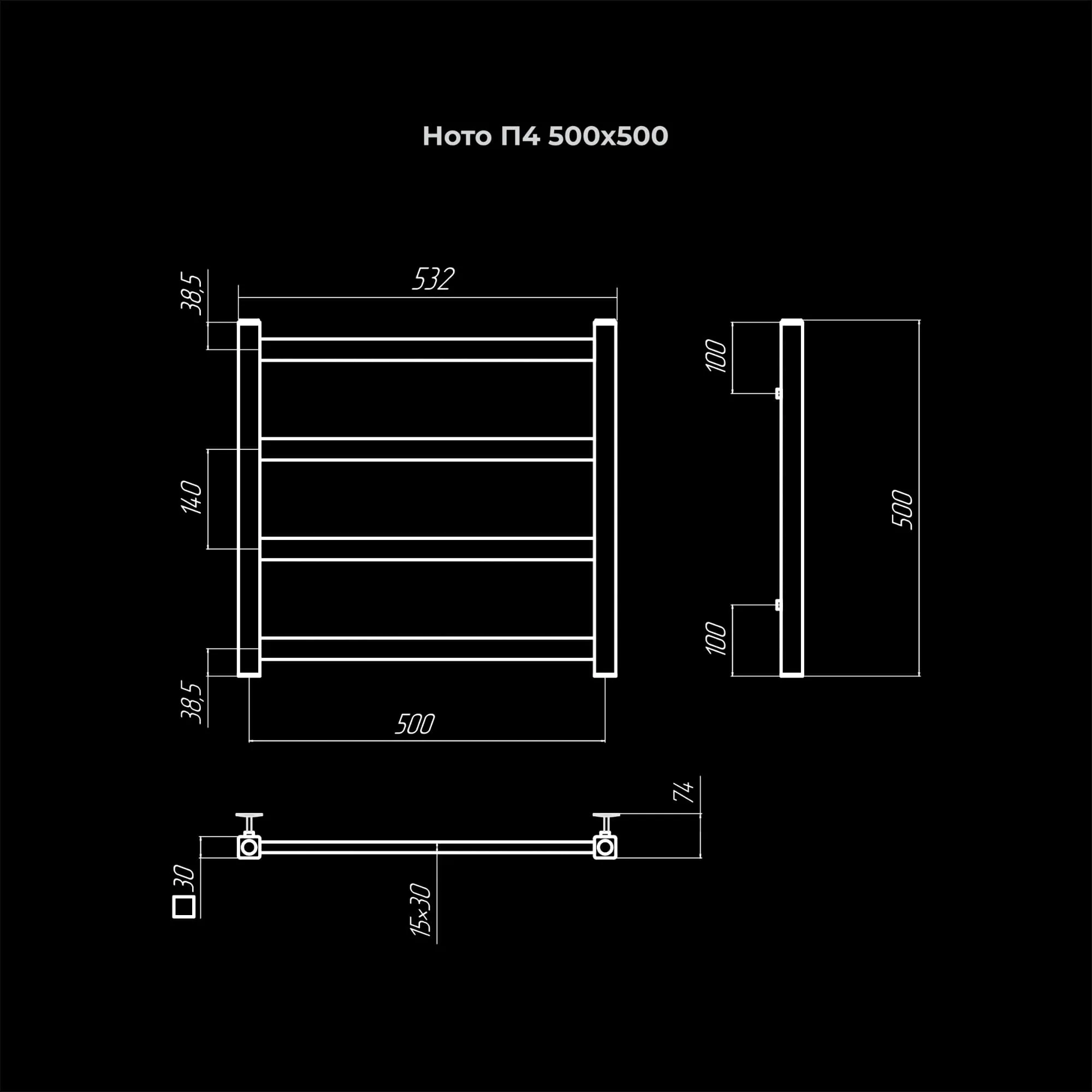 Полотенцесушитель водяной Terminus TREND Ното П4 500×500, 500 мм высотой, 530 мм шириной, 4 перекладины, нижнее подключение 1/2 дюйма, хромированный